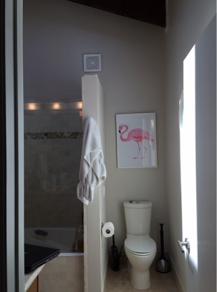 This space was enlarged by removing a wet bar in the adjacent loft space, thereby gaining an additional 24" in the overall length of the bathroom. Once we had that much space to work with, we were able to fit a " his and his" pair of vanities and two uplifting medicine cabinets. The double shower is visible from the dressing area of the bedroom and features a rear wall in book-matched Italian marble. (2017)