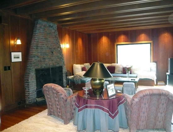 The living room in this Maybeck home had not been decorated in quite a while. The color scheme and furniture selections had become unappealing and dated, as had the visible track-lighting. Our goal became to restore the original personality of the room while bringing in fresh and luxurious furnishings and fabrics. The living room has been meticulously restored in this gem. All of the woodwork is original, as is the flooring, the rubble brick fireplace, and the one of a kind fire screen. The period lighting fixtures have been restored and new glass fittings have been hand-blown. Contemporary furnishings give new life to the room. (2007-2008)