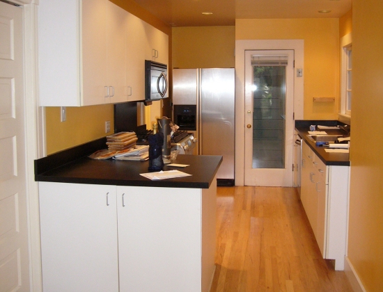 This before image of a previously remodeled kitchen reveals an awkward layout with no counter space adjacent to the refrigerator. Upper cabinetry that was not full height wasted potential storage space. The newly remodeled kitchen features a quality of cabinetry, appliances, and countertops that is far superior to the existing ones. The white on white kitchen feels much larger, and an adapted floor plan connects to the dining room in a way that improves the flow of guests from one room to another. (2006)