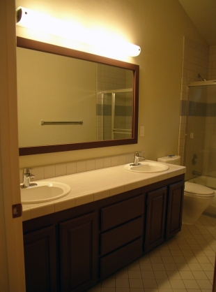 The original space was a rather bland 1970s guest bathroom. We wanted to impart a sense of modernity and style with this update while incorporating organic materials - natural walnut cabinetry and shaved pebble flooring which we contrasted with sage green glass tiles. (2013)