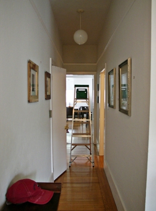 The existing hallway was narrow, and at best, utilitarian. Most of the period detailing had already been removed. The newly remodeled hallway incorporates refined track lighting, a very modern series of over-scaled sliding and barn doors, and it is significantly widened, thereby lessening the feeling of the typical railroad flat. (2007)