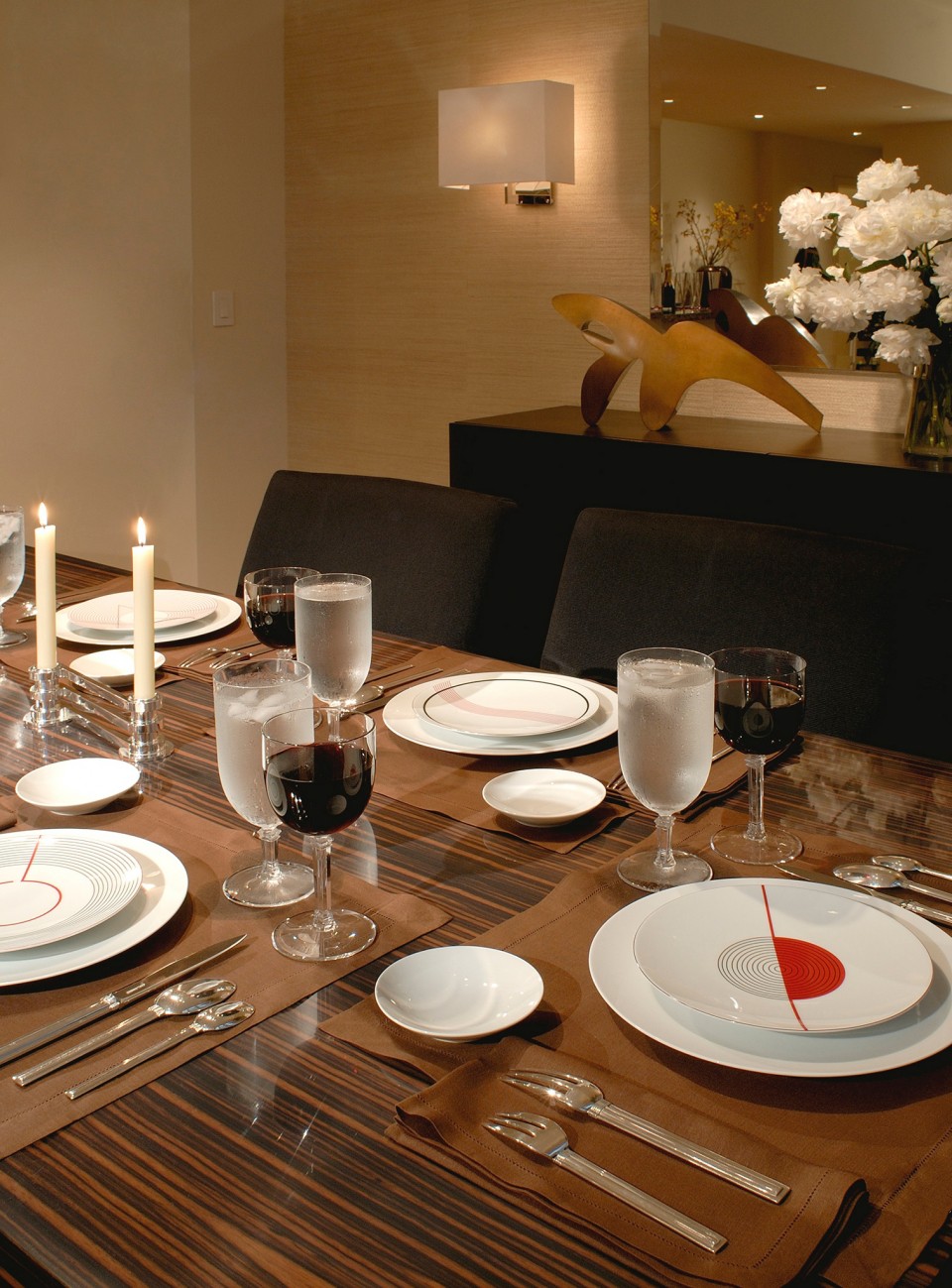 This dining table is an original design by Michael Merrill, ASID. It is executed in Macassar ebony which is the most sought after wood in fine furniture of the Art Deco period. Of particular note is the Jean Puiforcat sterling silver and dinnerware. (2006)