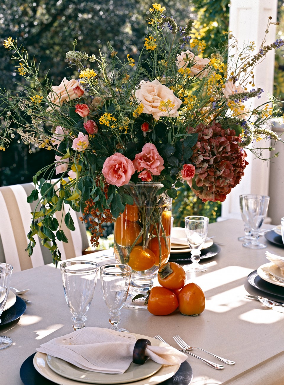 Even an outdoor dining table is enhanced by the addition of cut flowers. Notice the use of persimmons immersed in the vase as well as set out of the table top where they are offered to look at, to pick up and if you choose to eat. (1998)