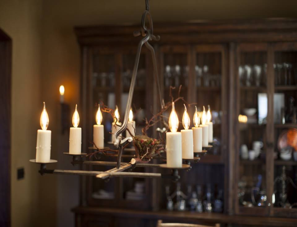 This tour de force of a chandelier brings tremendous scale and mood to the dining room. Here we have woven a tree branch, complete with bird's nest, into the wrought iron framework. It provides a lovely contrast. (2014)