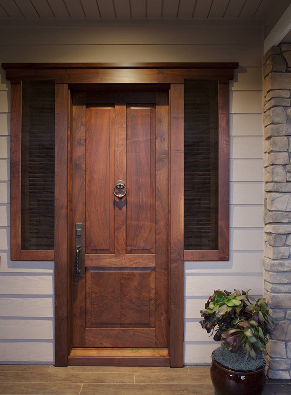 This magnificent entry door is an original design by Michael Merrill, ASID. Measuring eight feet in height and weighing nearly 200 pounds, this door is crafted from Claro Walnut dimensional lumber. The hand cast hardware is solid bronze. (2014)