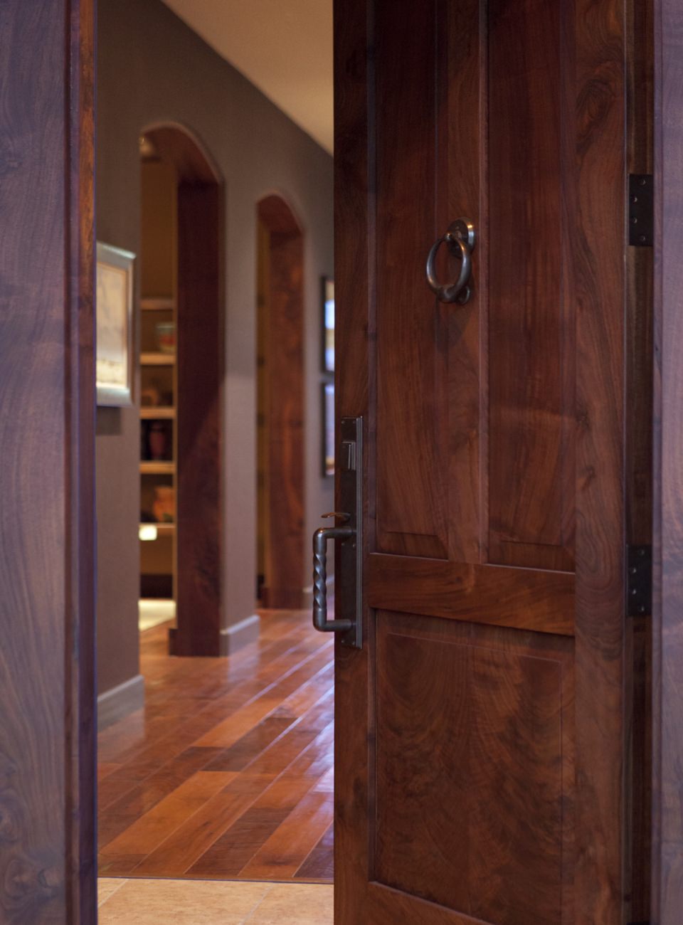 This entry door is an original design by Michael Merrill, ASID. It is crafted from dimensional Claro Walnut and weighs nearly 200 lbs. The door is fitted with cast bronze hardware from Sun Valley Bronze. (2014)