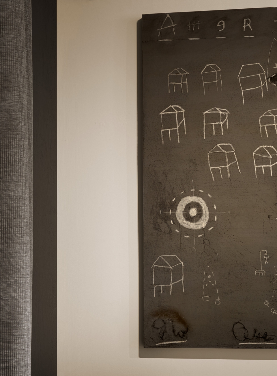 It is often said that the act of photography helps us learn how to see better. This is a perfect example of helping us to see the individual components in a much larger painting. These house-like structures somehow remind me of Katrina, especially with the warning presence of the bull's eye target. The triptych painting measures 15' 8" x 5' and is by noted artist Jerry King and is part of our corporate art collection. (2014)