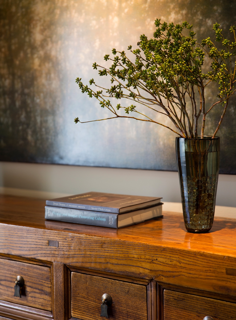 I am a firm believer in the use of inexpensive items mixed with very fine items. Here we have used a very elegant antique Chinese tansu with a moody contemporary painting by Tom Monaghan. The vase, filled with seeded eucalyptus berries, is from Crate and Barrel - but no one would suspect as the pieces work together in perfect harmony. (2014)