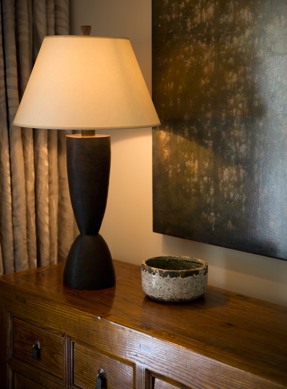 This is another example of working with this lovely Chinese antique tansu, using the beguiling contemporary painting by Tom Monaghan, and using a very fine bronze lamp against an extremely affordable pottery bowl. Who would suspect that the bowl wasn't a rare piece of workmanship? (2014)