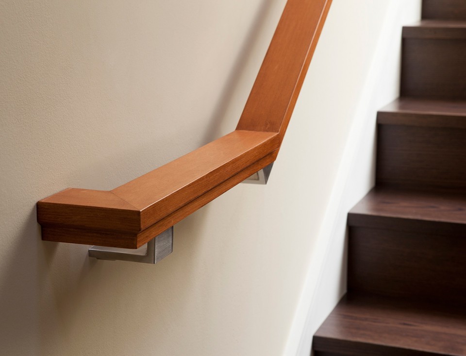 This handrail was designed to fit into the overall context of the residence, while still being distinctly modern. Hardware is stainless steel and the handrail itself is vertical grain Douglas-fir. (2013)