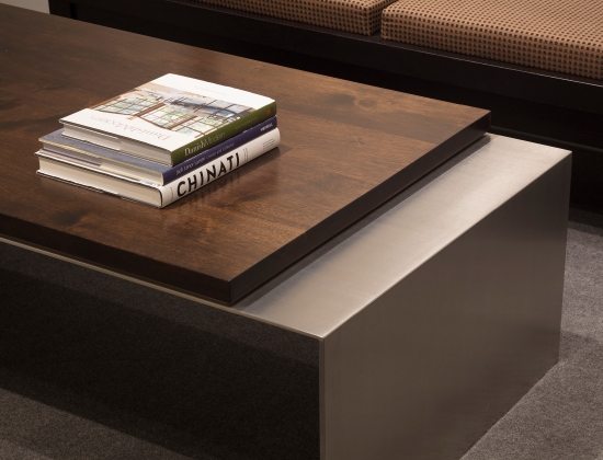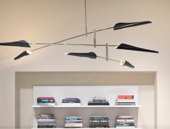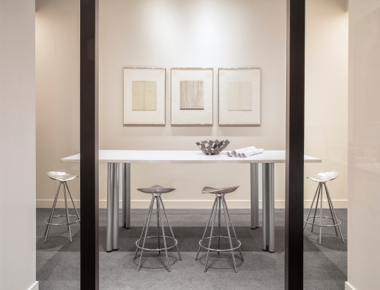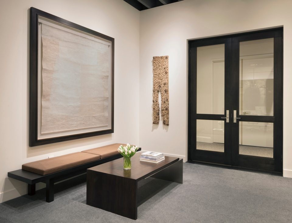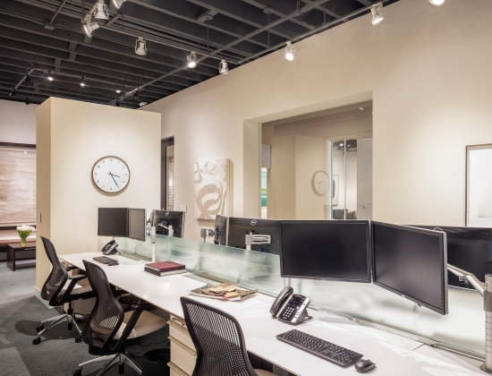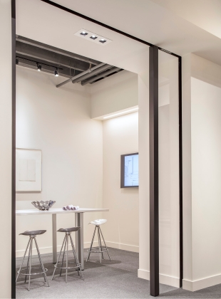 For the last twenty years we have occupied four spaces, including Jackson Square, the Design District, Showplace Design Center and now the Galleria Design Center. With each move we have been able to adapt and refine our original idea - a serene achromatic space with elegant detailing and finishes, built around white and aluminum Knoll furnishings. Along the way we have made minor adjustments to the furnishings, incorporated numerous custom elements, and we have increased the size of our art collection. Our newest offices are completely redesigned from the previous tenant. We have rearranged the windows and doors and created a large open studio space, which borrows daylight from our across-the-hall neighbors. We now enjoy the luxury of a large reception room, a separated design studio and a semi-private office with adjoining conference/workroom for the principal. One of our favorite new pieces is a lighted mobile pendant by noted New York artist David Weeks.