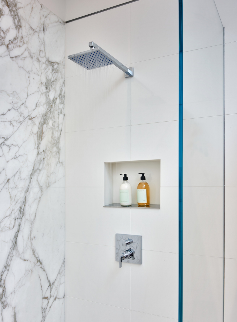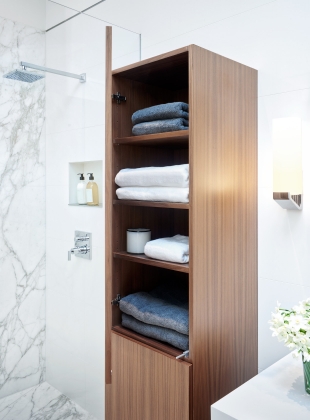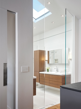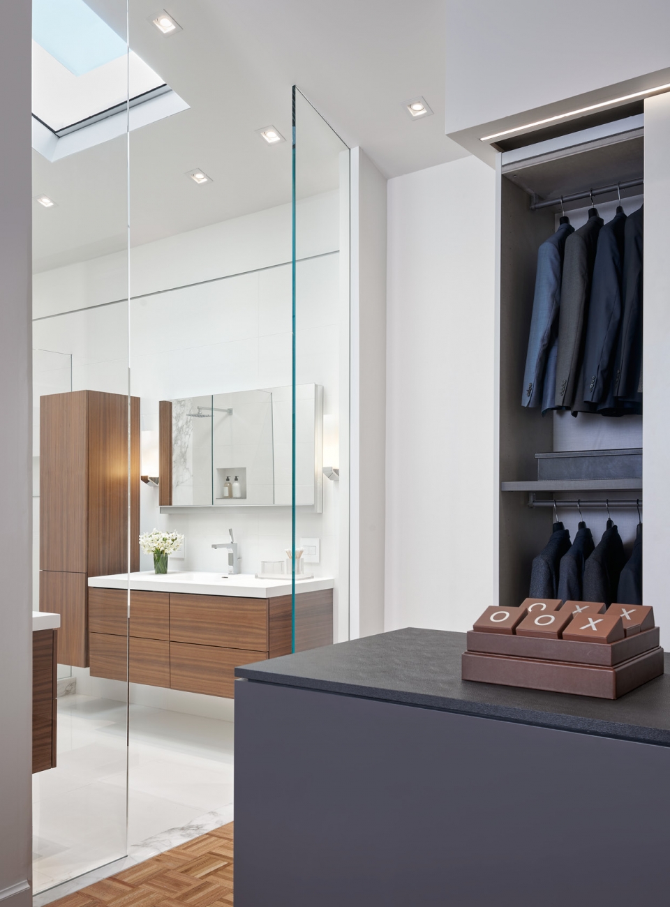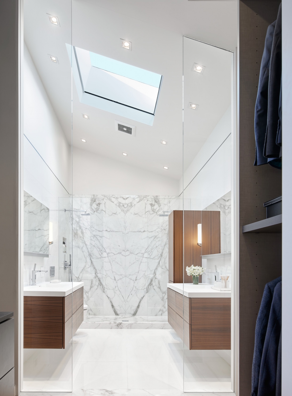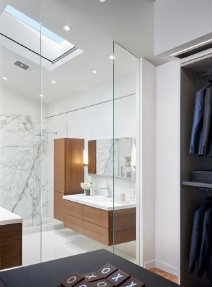 We were asked to create a very elegant master bathroom in this period 70's residence. We left many of the adjacent elements and finishes in place but created an entirely new aesthetic in the bathroom and dressing area. Four wing walls of low-iron glass are used in conjunction with the dramatic rear wall of Italian marble, beautifully book matched. Floors are 30 X 30 porcelain tiles. The pair of medicine cabinets left up to revel ample storage within the deep cabinets. Walnut cabinetry is custom designed by our studio. The skylight features a completely concealed shade which blocks out the sunlight completely, for those weekend days when you might want to sleep in late.