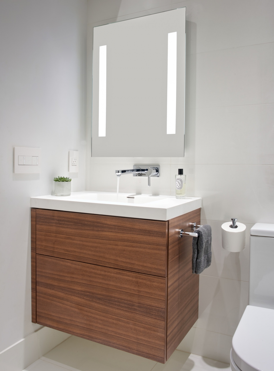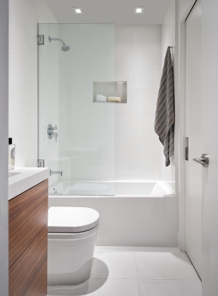 A more modest bathroom on the first level serves the guest bedroom and dinner guests.