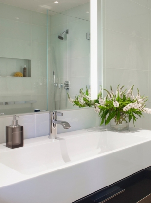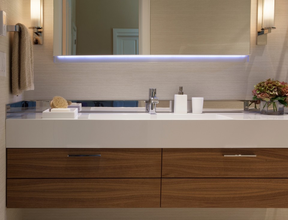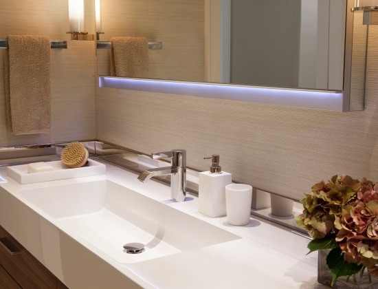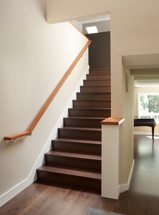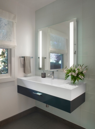 Upstairs, the bathroom has a much more organic feel, using a shaved pebble floor, linen textured vinyl wall covering, and a watery green wall tile. Here the vanity is veneered in a rich walnut. The residence, nestled on 20 acres of heavily wooded land, has been meticulously detailed throughout, with new millwork, hardware, and finishes. (2012-2013)