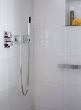 This residence had been recently remodeled, with the exception of two of the bathrooms. The newly enlarged downstairs bathroom now has a spa-like atmosphere. It serves pool guests as well as house guests. Over-scaled tile floors and glass tiled walls impart a dramatic modernity to the space. Note the polished stainless steel ledge in the shower niche. A German lacquered vanity and a Jack Lenor Larsen roman shade complete the space.